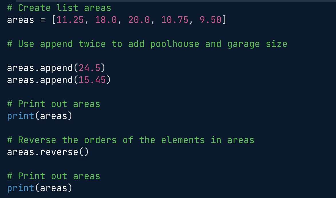 - .reverse() method는 사용할때 () 안에 어떤 값도 넣지 않는다. 저렇게 되면 areas 의 리스트에 있는 값들을 뒤에서 부터 출력한다.